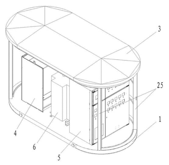 箱體外殼由材料層、龍骨與防護(hù)鋼板層三層組成,可以較好地對(duì)變電站內(nèi)的用電設(shè)備進(jìn)行較好地保護(hù);箱體外殼為橢圓柱狀,結(jié)構(gòu)更加緊密牢固。箱體外殼的前表面設(shè)置有雙開(kāi)門(mén),箱體外殼的表面均勻地設(shè)置有電纜線孔且所述電纜線孔內(nèi)貫穿有電纜線。與周?chē)沫h(huán)境相適應(yīng),同時(shí)也提高了變電站的通風(fēng)散熱的效率。