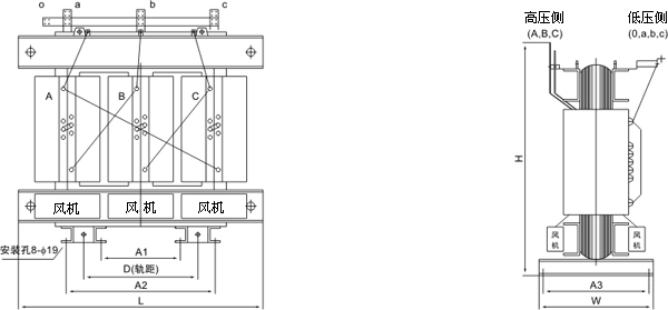 注:容量200kVA及以下不帶風(fēng)機,否則在訂貨時需闡明。本表之外的規(guī)格和特殊要求可聯(lián)系洽談。