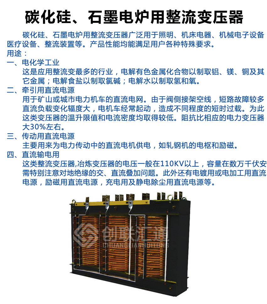 碳化硅、石墨電爐用整流變壓器廣泛用于照明、機(jī)床電器、機(jī)械電子設(shè)備、醫(yī)療設(shè)備、整流裝置等。產(chǎn)品性能均能滿足用戶各種特殊要求。