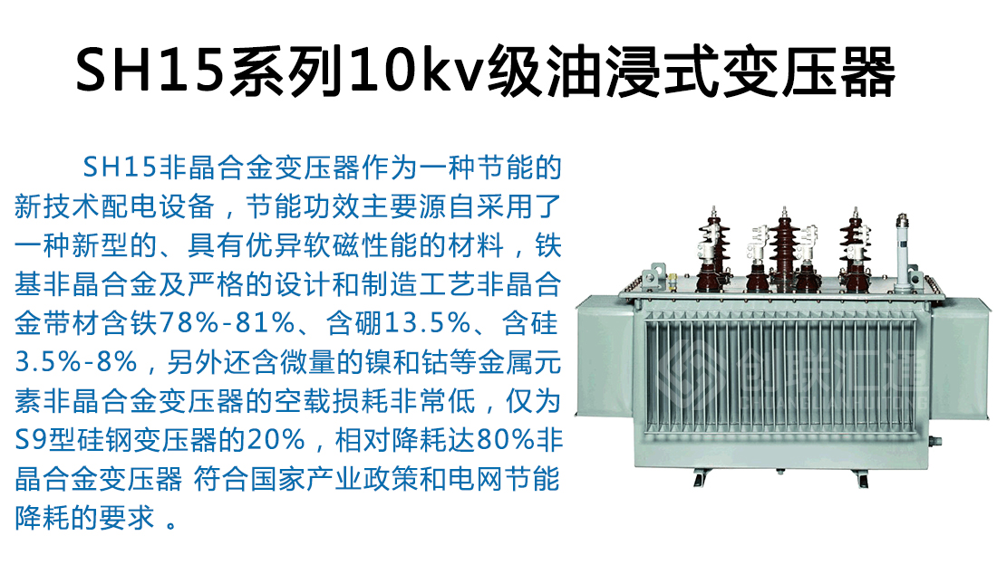 SH15非晶合金變壓器作為一種新一代節(jié)能產(chǎn)品,可以普遍適用于住宅小區(qū)、學(xué)校、工礦企事業(yè)單位以及社會(huì)公共設(shè)施。可在戶內(nèi)(外)使用,容量在315kVA 及以下時(shí)可安裝在桿上,海拔高度不超過(guò)1000m。