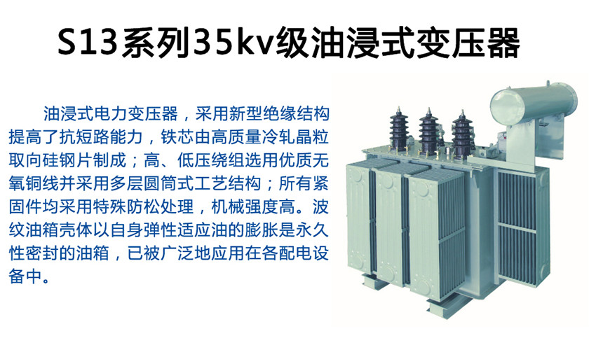 S13油浸式全密封配電變壓器,不同于普通油浸式變壓器,它取消了儲油柜,由油箱體的波紋板式散熱片來散熱冷卻,其彈性脹縮補償油體積的增減。各系列產(chǎn)品適用在10KV、20KV、35KV輸配電系統(tǒng)中,可供居民區(qū)、商業(yè)街道、工礦企業(yè)和農(nóng)村動力及照明之用。